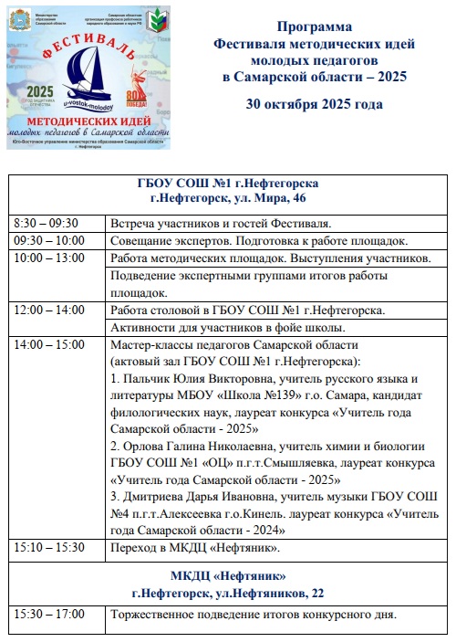 Фестиваль проводится 30 октября 2025 года в ГБОУ СОШ №1 г.Нефтегорска (ул. Мира, 46)